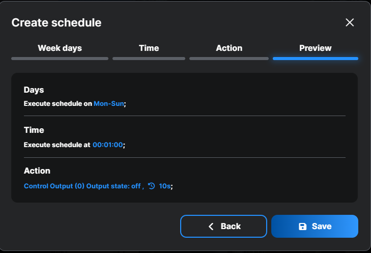 После сохранения расписание появится в разделе «Расписания» для конкретного устройства.