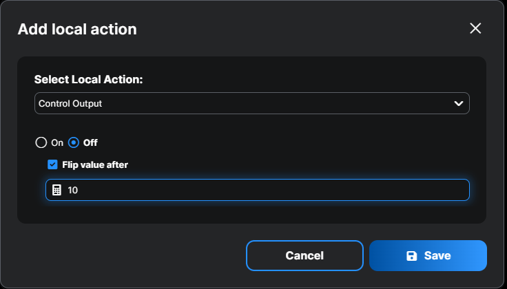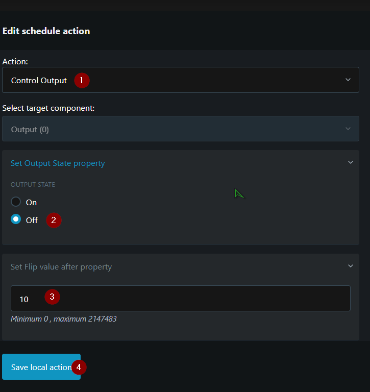 - Добавить расписание: На вкладке Действие сначала нажмите Добавить локальное действие, затем настройте локальные параметры действия. Значение после — это время, по истечении которого Shelly Plug возобновит подачу питания на маршрутизатор после его выключения. После сохранения конфигурации нажмите Далее, чтобы перейти к последнему шагу — Предварительному просмотру.