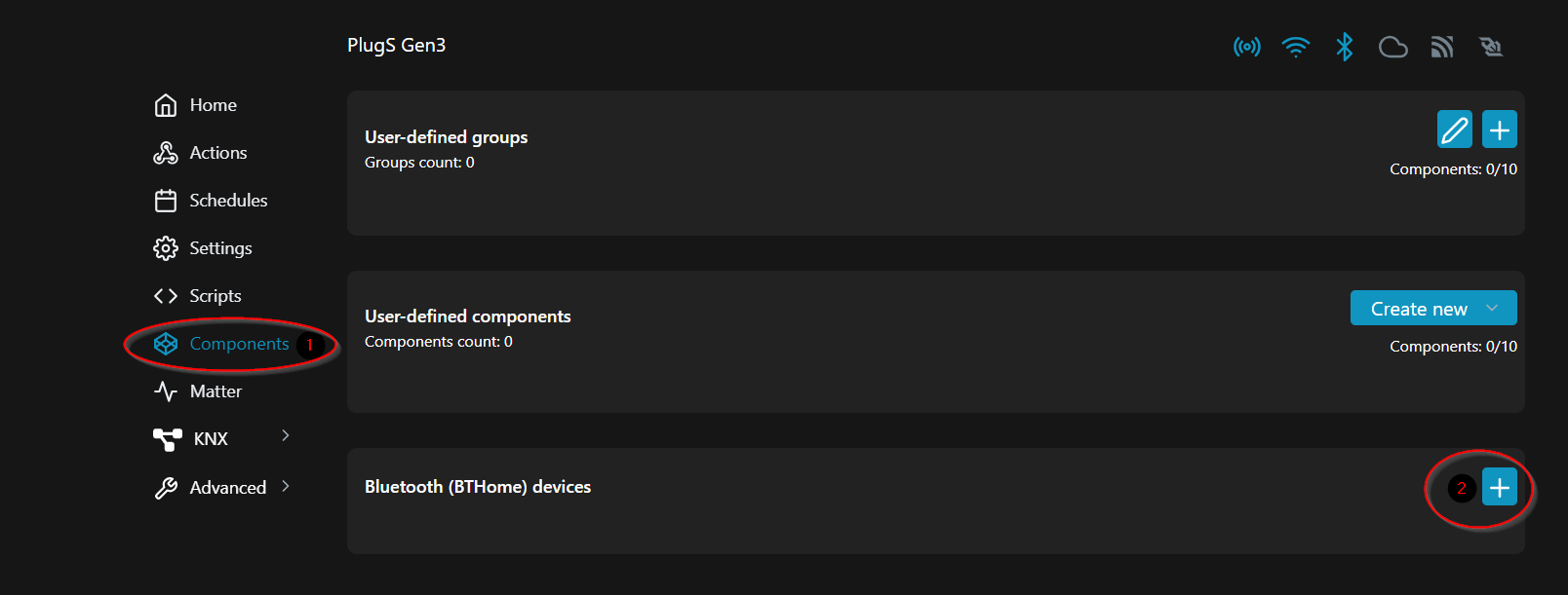 [править]После включения Bluetooth-модуля и активации функции шлюза необходимо добавить устройство (устройства), которое мы хотим использовать. В нашем случае это датчик движения BLU Shelly. Для интеграции внешних устройств необходимо добавить их как отдельные компоненты. Выполните следующие шаги, чтобы добавить BLE-устройство. Встроенный веб-интерфейс перейдет в раздел «Компоненты»,