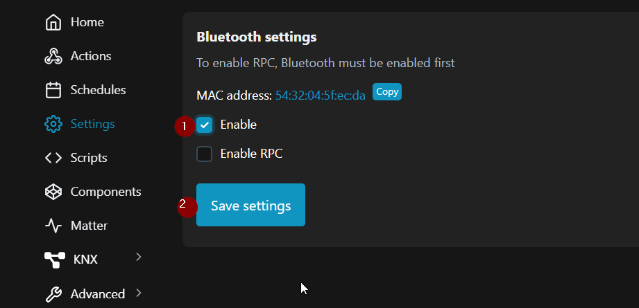 [править]В качестве шлюза Bluetooth мы используем Shelly Mini 1 Gen3, и нам необходимо включить на нем функцию шлюза Bluetooth. Для этого откройте встроенный веб-интерфейс устройства в браузере, подключенном к той же сети, что и BLE Gateway, и перейдите по адресу http://