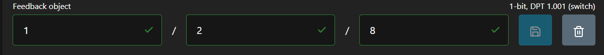 - Объект обратной связи — уведомляет все другие устройства, использующие тот же адрес группы, о состоянии переключения DALI Dimmer GEN3, т.е. ВКЛ/ВЫКЛ. Убедитесь, что длина DPT одинакова. В этом примере это GA 1/2/8. Введите его в соответствующие поля и нажмите кнопку «Сохранить».