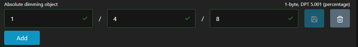 - Объект абсолютного диммирования — укажите адрес группы, используемый для управления диммированием с помощью 1-байтового кода, т.е. для управления точным диммированием. Убедитесь, что длина DPT одинакова. В этом примере это GA 1/4/8. Введите его в соответствующие поля и нажмите кнопку «Сохранить».