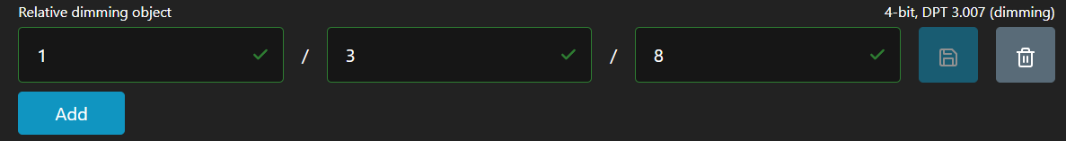 - Объект относительного диммирования — укажите адрес группы, используемый для 4-битного управления диммированием, т.е. ДИММИРОВАНИЕ ВВЕРХ/ДИММИРОВАНИЕ ВНИЗ. Убедитесь, что он имеет ту же длину DPT. В этом примере это GA 1/3/8. Введите его в предоставленные поля и нажмите кнопку «Сохранить».