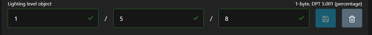 - Объект уровня освещенности - уведомляет все остальные устройства, использующие тот же групповой адрес, об уровне затемнения диммера DALI GEN3 в процентах (0-100%). Убедитесь, что длина DPT одинакова. В этом примере это GA 1/5/8. Введите ее в предоставленные поля и нажмите кнопку «Сохранить».
