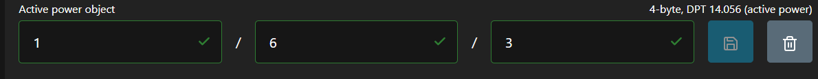 - Объект активной мощности - представляет собой скорость потребления электроэнергии в системе. Эта скорость передается через назначенный групповой адрес. В этом примере мы используем GA 1/6/3. Введите адрес в соответствующие поля и нажмите кнопку «Сохранить».