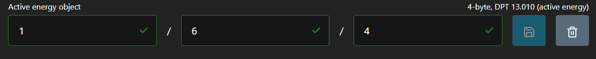 - Объект активной энергии — отслеживает потребление активной энергии с течением времени, предоставляя кумулятивные данные об общем потреблении энергии нагрузкой. Потребленная энергия отображается через назначенный групповой адрес всем другим устройствам, которые его используют. В этом примере мы используем GA 1/6/4. Введите адрес в предоставленные поля и нажмите кнопку «Сохранить».