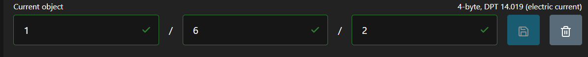 - Объект тока - предоставляет данные о токе, протекающем через подключенную нагрузку (нагрузки), в режиме реального времени через назначенный групповой адрес всем другим устройствам, которые его используют. В этом примере мы используем GA 1/6/2. Введите адрес в соответствующие поля и нажмите кнопку «Сохранить».