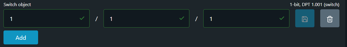- Объект переключателя — укажите адрес группы, используемый для управления переключением, т.е. ВКЛ/ВЫКЛ. Убедитесь, что он имеет ту же длину DPT. В этом примере, согласно данным в «Таблице 2», GA равен 1/1/1. Введите его в соответствующие поля и нажмите кнопку «Сохранить».