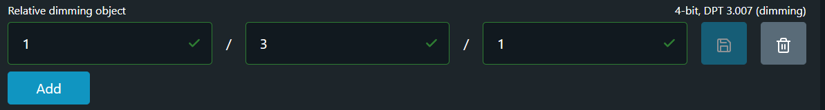 - Объект относительного диммирования — укажите адрес группы, используемый для управления относительным диммированием, т.е. ступенчатого диммирования вверх или вниз. Убедитесь, что он имеет ту же длину DPT. В этом примере нам необходимо назначить новый GA, поскольку этот тип управления отсутствовал в исходной конфигурации KNX. Согласуйте это обновление системы с вашим интегратором KNX и запросите новый GA. В данном случае у нас есть Ga 1/3/1. Введите его в соответствующие поля и нажмите кнопку «Сохранить».