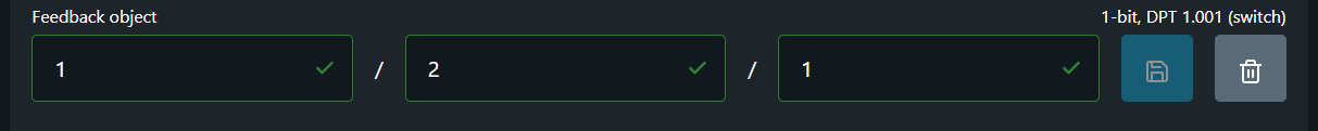 - Объект «Обратная связь» — уведомляет все другие устройства, использующие тот же групповой адрес, о состоянии переключения выхода Shelly PRO Dimmer 1PM, т.е. ВКЛ/ВЫКЛ. Убедитесь, что длина DPT совпадает. В этом примере это GA 1/2/1. Введите это значение в соответствующие поля и нажмите кнопку «Сохранить».