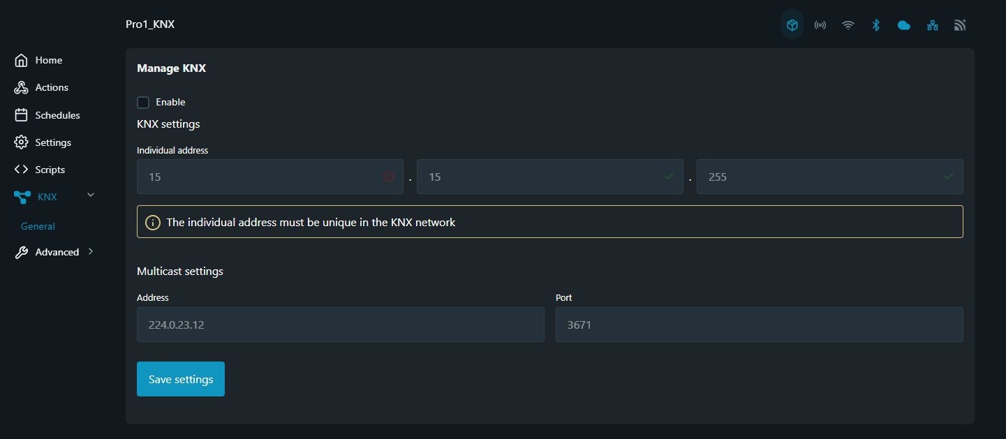 Для корректной работы KNX на устройстве Shelly необходимо правильно заполнить все поля в этом разделе общей конфигурации: «Включить» — должно быть включено, «Индивидуальный адрес» — должно быть заполнено, и «Многоадресный адрес» — должно быть синхронизировано с конфигурацией маршрутизатора KNX IP / сервера KNX.