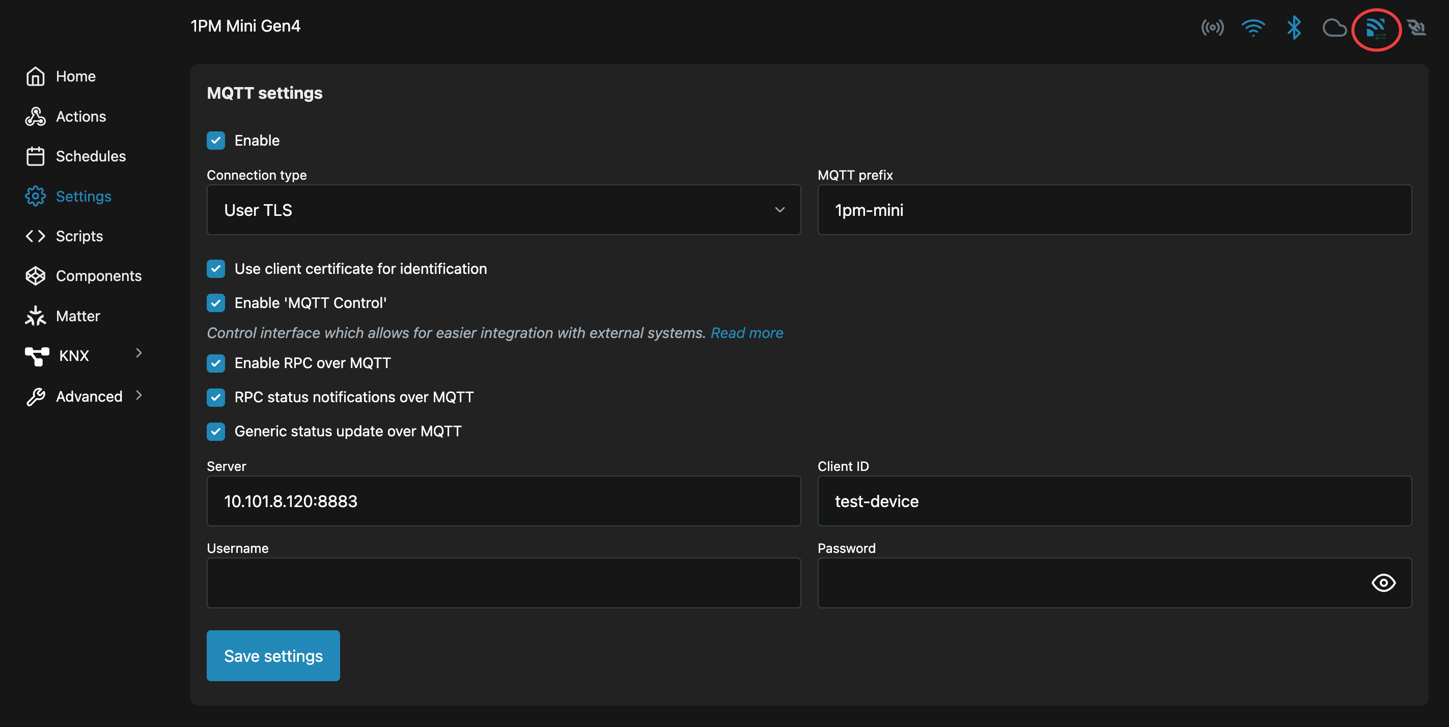 Вы также можете подтвердить успешное подключение в веб-интерфейсе Shelly: значок MQTT в правом верхнем углу показывает две стрелки при подключении. Если вы видите стрелки, устройство активно связано с RabbitMQ по протоколу MQTT/TLS.