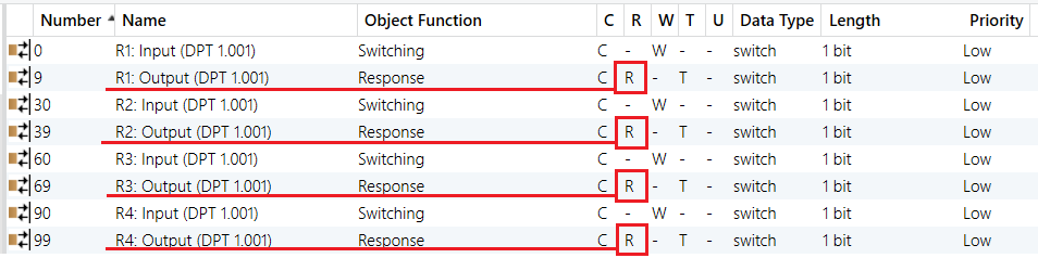 Рис. 4 - Измененный флаг чтения объектов обратной связи канала X Обратите внимание, что производители KNX могут давать разные имена на своем оборудовании для объекта переключателя и для объекта обратной связи . Например, в приведенном выше случае для канала [X] (1-4) производитель использует 'R[X] Input' для объекта переключателя