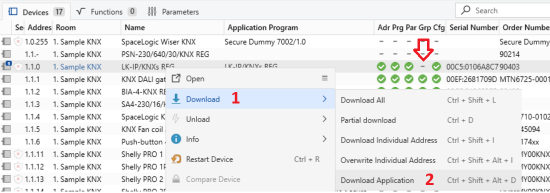 Необходимо перенести все внесенные изменения обратно на затронутые устройства KNX.