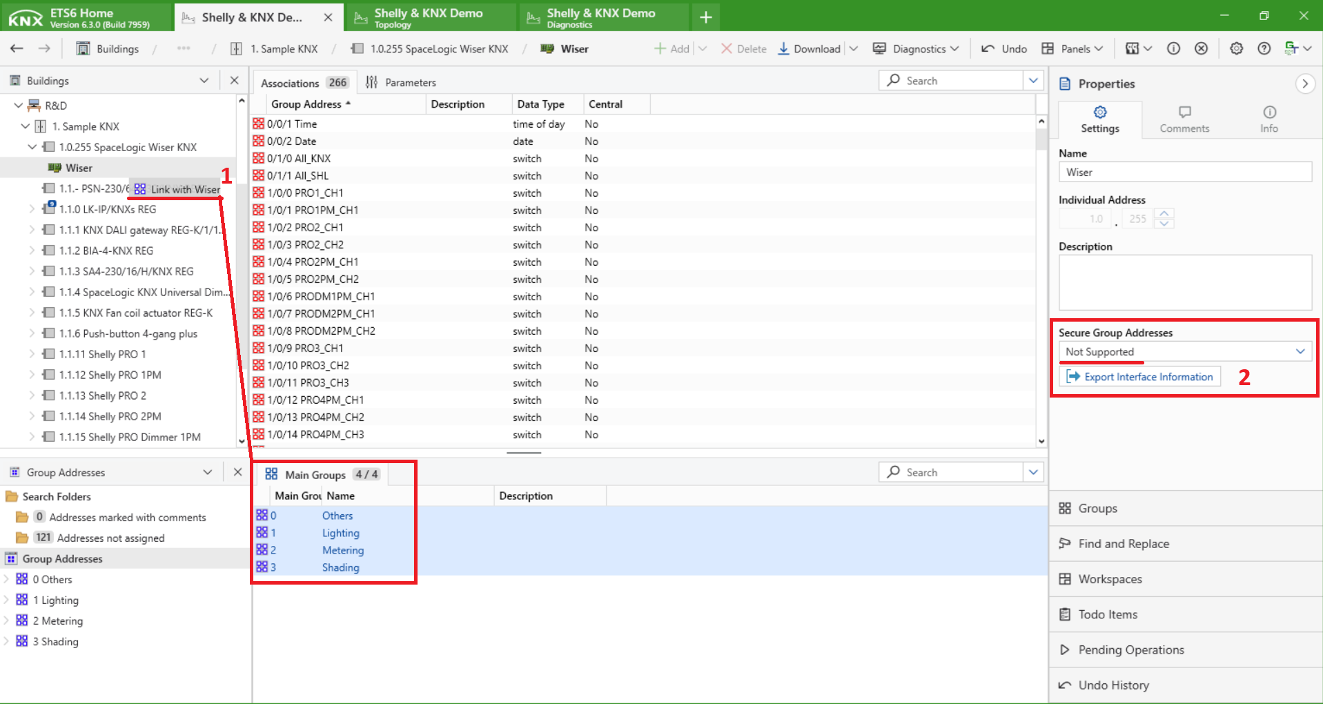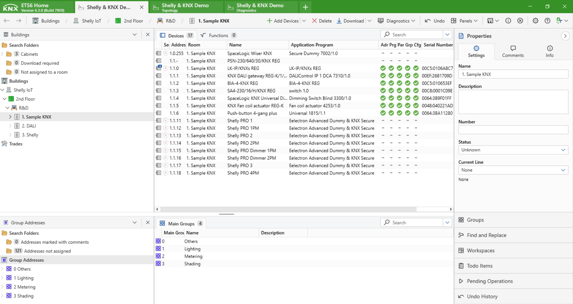 3. ETS v6.3.0 больше не поддерживает ручное редактирование таблицы фильтров — что мне делать? В предыдущих версиях ETS (до v6.3.0) пользователи имели возможность вручную редактировать таблицу фильтров. Это позволяло точно настраивать, какие групповые адреса устройство будет фильтровать или пропускать. Однако эта функциональность была удалена начиная с версии ETS 6.3.0. Более подробную информацию об этом решении Ассоциации KNX можно найти здесь. В результате использование только «фиктивного» файла ETS для устройств, расположенных на линии KNX TP, больше недостаточно. Теперь требуется дополнительный фиктивный файл, представляющий устройство на основной IP-линии. Эти фиктивные файлы обычно предоставляются производителями устройств центрального управления (например, серверов KNX) и средств визуализации (например, дисплеев KNX). Для этой цели мы в Shelly выбрали приложение Eelectron Advanced Dummy для представления устройств Shelly в программном обеспечении ETS. Выбранный фиктивный файл специально разработан для использования только на линии TP. На рисунке 1 показан выбранный фиктивный файл в использовании. Рис. 1 — Пример файла приложения Advanced Dummy от Eelectron. Выбранное приложение Dummy позволяет полностью настраивать содержащиеся в нем объекты KNX. На рисунке 2 показано устройство Shelly Pro Dimmer 1PM, уже настроенное с помощью указанного файла Dummy. Рис. 2 — Конфигурация Shelly PRO Dimmer 1PM. После того, как все устройства добавлены в проект, им присвоены индивидуальные адреса, а необходимые объекты групп связаны с соответствующими адресами групп, следующим шагом является обеспечение включения этих адресов групп в таблицу фильтрации используемого IP-маршрутизатора KNX. Как упоминалось ранее, ручное редактирование таблицы фильтров больше не поддерживается в ETS версии 6.3.0 и более поздних. Поэтому необходимо добавить виртуальное устройство на «Основную IP-линию», чтобы автоматически заполнить таблицу фильтров. На рисунке 3 показано устройство KNX IP Dummy, которое мы выбрали для этой цели — Schneider Electric SpaceLogic KNX Secure Dummy. Рис. 3 — Файл-заглушка Schneider Electric Wiser for KNX. Как показано на рисунке, столбец «Тип среды» указывает, что устройство может быть добавлено либо в сегмент TP, либо в IP-сегмент проекта. В этом случае добавьте устройство-заглушку Schneider Electric SpaceLogic KNX Secure Dummy в «Основную IP-линию» проекта, как показано на «Рисунок 4».