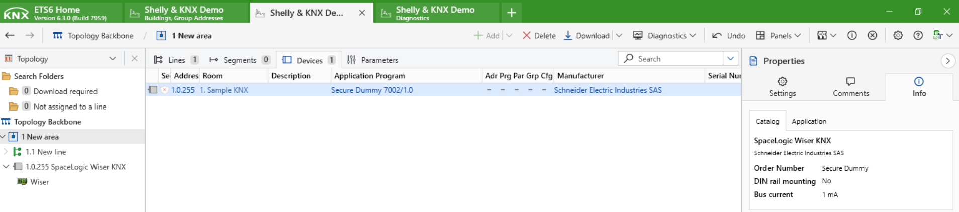Рис. 4 - Добавление устройства Schneider Electric SpaceLogic KNX Secure Dummy к основной IP-линии Следующий шаг — связать групповые адреса, используемые устройствами Shelly, с интерфейсом Dummy устройства Schneider Electric SpaceLogic KNX Secure Dummy