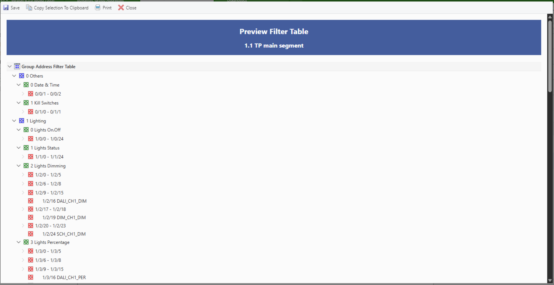 . Рис. 8 - Проверка таблицы фильтров через основную линию TP Предварительный просмотр окончательной таблицы фильтров подтверждает, что все настроено правильно — маршрутизатор KNX IP теперь правильно сконфигурирован, и все необходимые групповые адреса включены. Таким образом, интеграция завершена и готова к работе. «См. рисунок 9 ниже для предварительного просмотра итоговой таблицы фильтров». Рис. 9 - Предварительный просмотр таблицы фильтров Если вы выполнили все описанные выше шаги, ваша настройка теперь должна быть полностью функциональной и соответствовать стандарту KNX — готовой к надежной и эффективной работе. «Если у вас возникнут какие-либо проблемы или дополнительные вопросы, не стесняйтесь обращаться в нашу службу поддержки — мы здесь, чтобы помочь!»